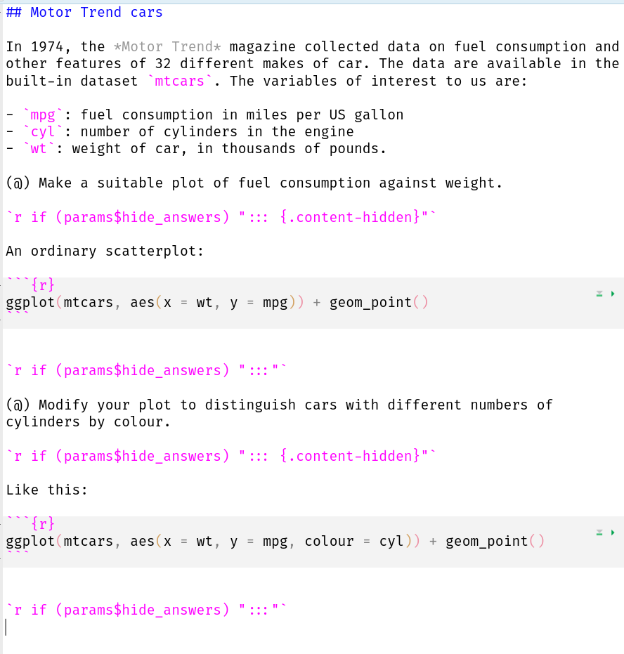 includeQuarto “shortcode”. I think this is the cleanest way to do it, but you could also use R Markdown style “child documents” here. This works as if the file contents have been literally copied and pasted where theincludeis, and has the effect that the parameters (that is, the value ofhide_answers) are passed down into the included files. When I refer toparams$hide_answersinsidemotor-trend.qmd(as I did above), it uses the right value and correctly includes or excludes the solutions.