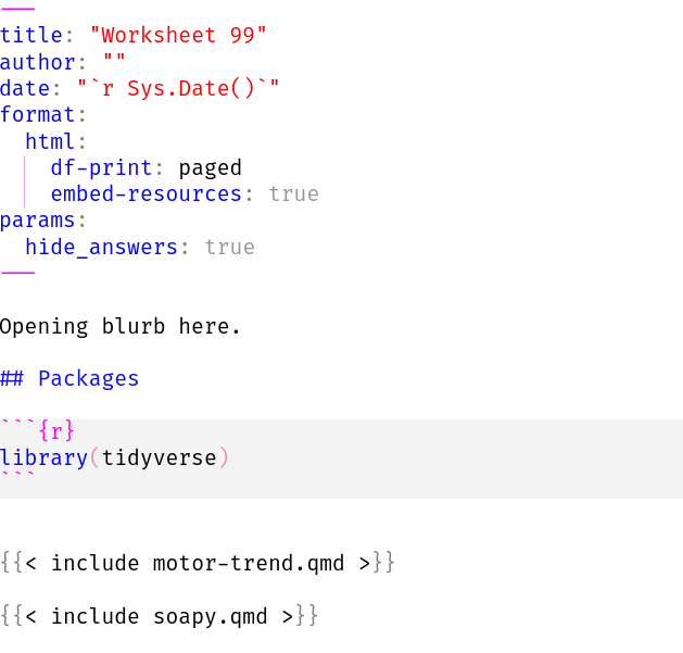 These contain a number of questions based on a small number (usually two or three) scenarios. I like each scenario and its associated questions to live in a separate Quarto file (for ease of moving to another worksheet or assignment later, in case I don’t get as far in class as I had anticipated). I also want the worksheets to be available with and without solutions. (My students see a worksheet without solutions at their tutorial, and they get to try it with a TA available for help. After the tutorials are all done for the week, I post the solutions so that the students can see how they did).