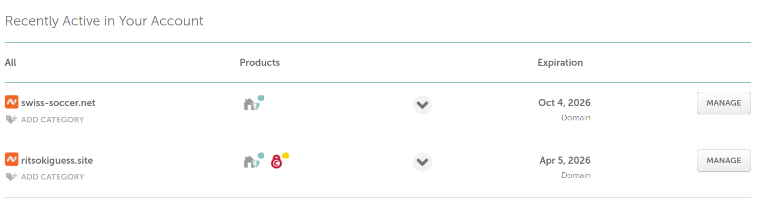 Your domain has a domain registrar (the people you pay money to each year to keep your domain yours). Mine is namecheap.com; godaddy.com is another one. When you log into your domain registrar’s website, you’ll see a list of the domains you have registered with them. I own two domains, so mine looks like this:
