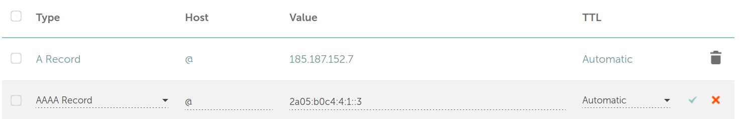 When a visitor to your domain types mydomain.com into their web browser, their browser needs to know what to show them in response. This is accomplished by converting the address the user typed into an IP address. grebedoc.dev is going to do the work of making your website visible to the world, so it is Grebedoc’s IP address that you need to provide. There are actually two forms of IP address: IPv4, the four numbers separated by dots that you are probably familiar with, and the newer IPv6, which looks like hex codes separated by colons.