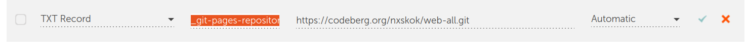 The last one is the Git HTTPS clone URL of the Codeberg repo where your rendered website lives. Substitute appropriately for your situation. Be careful to get the right Host; there should be an underscore at the front, and minuses between each word. Here are mine, after I am finished (the Host for the TXT record only shows part of the value):2