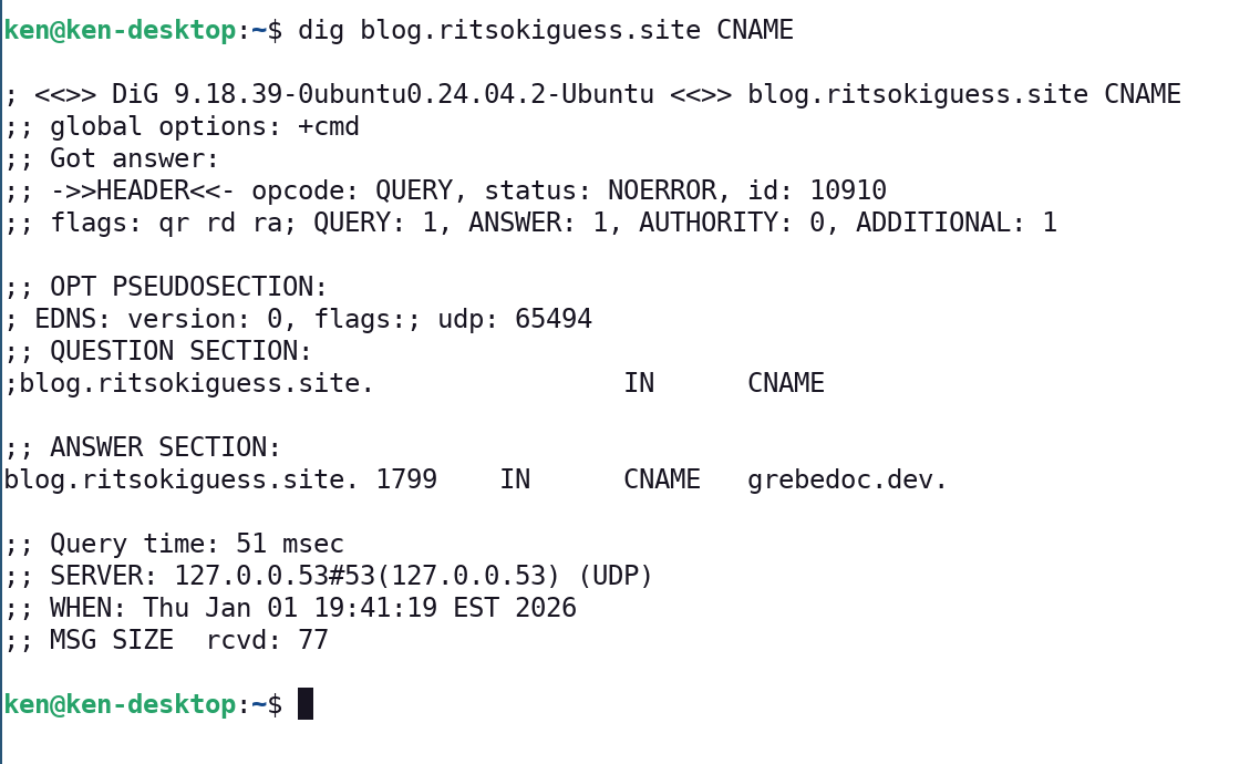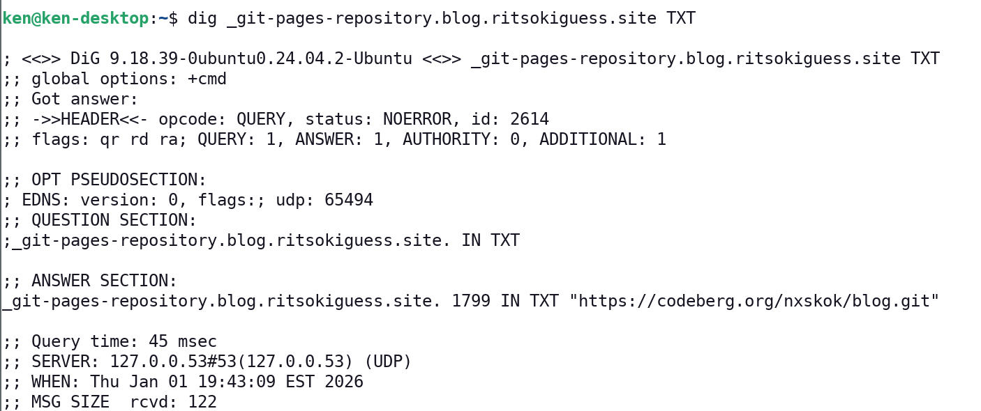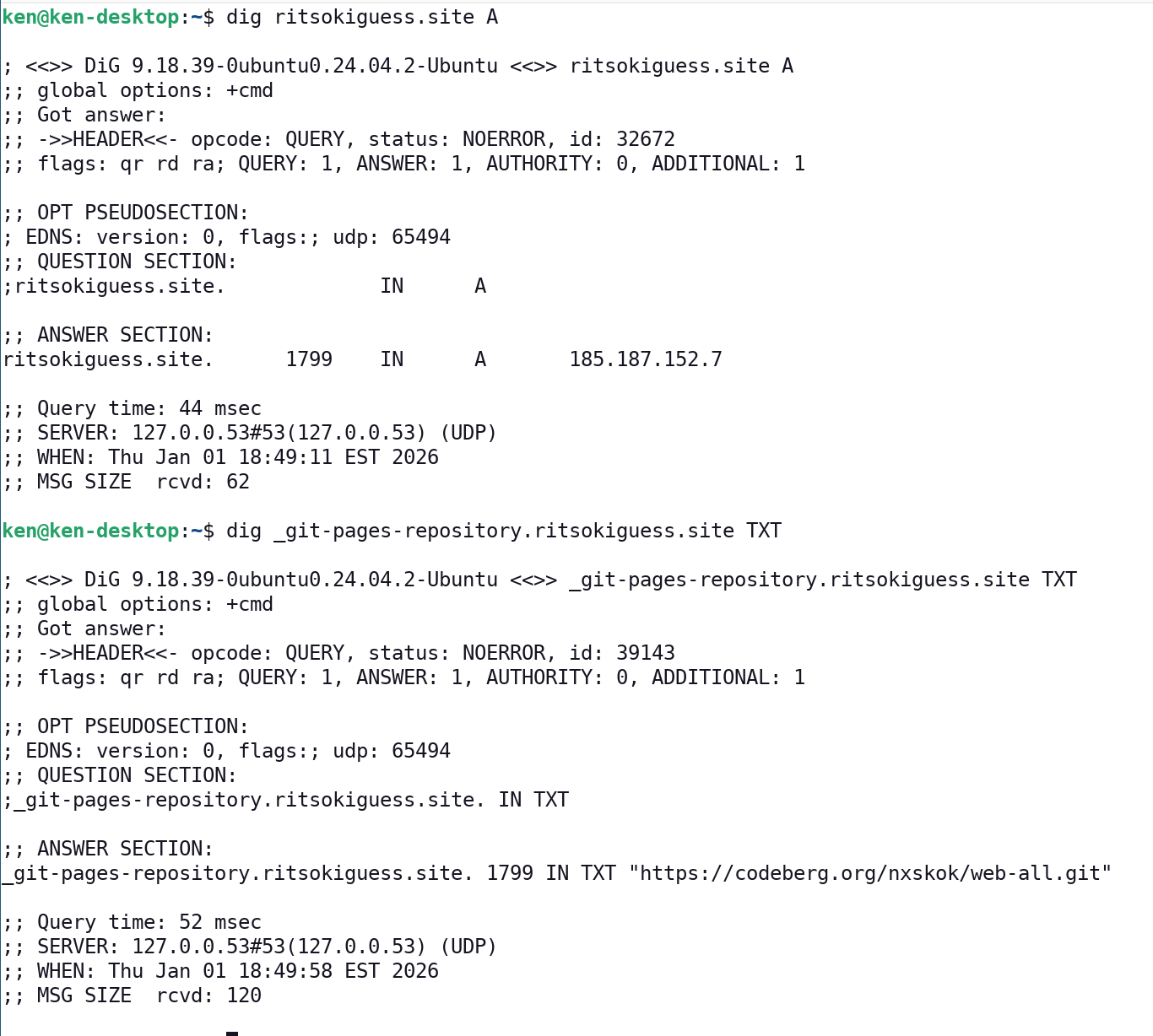 dig requires a domain name, possibly with a subdomain on the front, and the Type of DNS record you want to look up. You should see an ANSWER SECTION in the output. For the A record, this should have your domain name first, and the Grebedoc IP address at the end. For the TXT record, the ANSWER SECTION should have the HTTPS git clone address of your Codeberg repo.