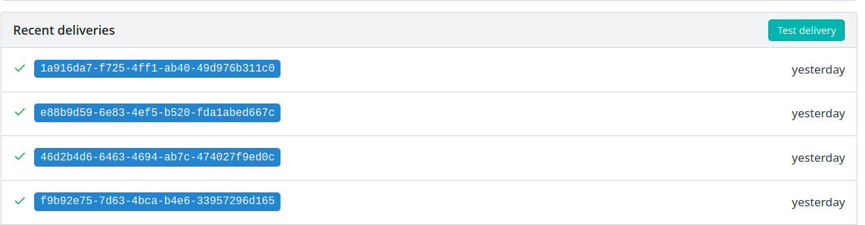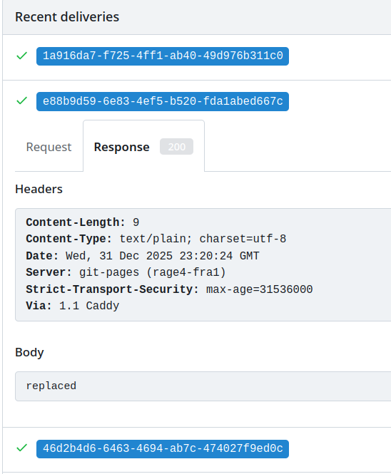 Now, the next time you push your website, it should appear at your domain. It can take a few minutes for everything to come together. If you need to troubleshoot, make sure the dig output above makes sense, and make sure the webhook is working properly. To do that, go to Settings and Webhooks again. This time, you should see your domain listed among the webhooks. Click on the pencil on the right. At the bottom, you should see one or more Recent Deliveries (one for each push):