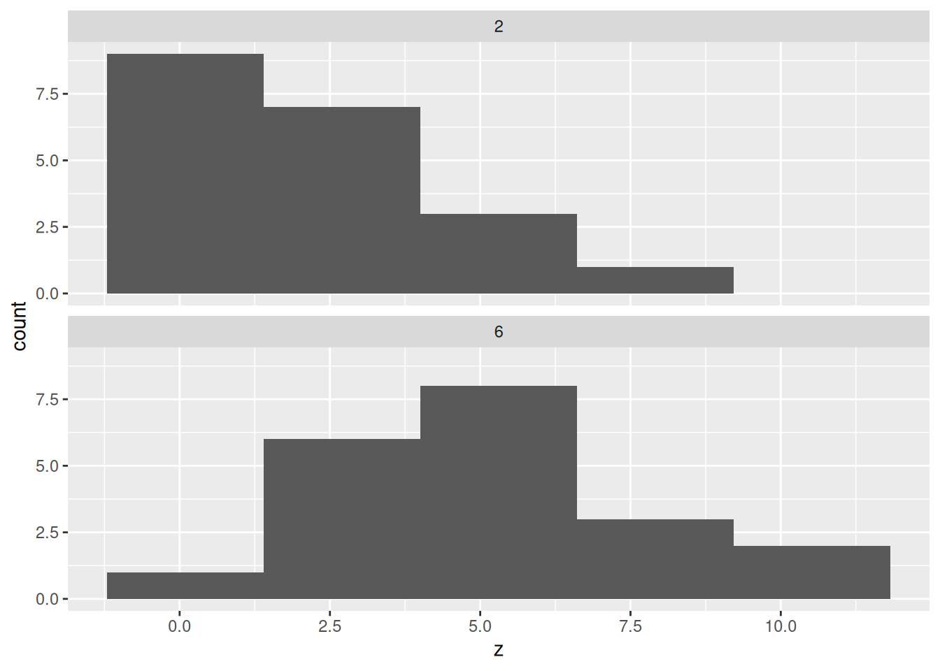 tibble(gp =c("x", "y"), n = n, mean = mean, sd = sd) %>%rowwise() %>%mutate(z =list(rnorm(n, mean, sd)))