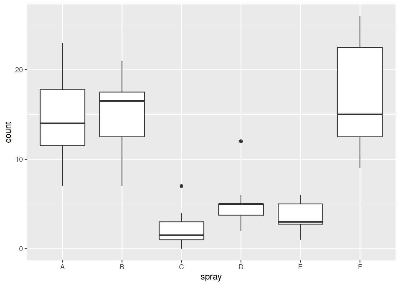 A look at the boxplot suggests that the sprays divide into two sets: A, B, F (high insect count), and C, D, E (low). This is how Games-Howell comes out, though the C-D difference is almost significant.